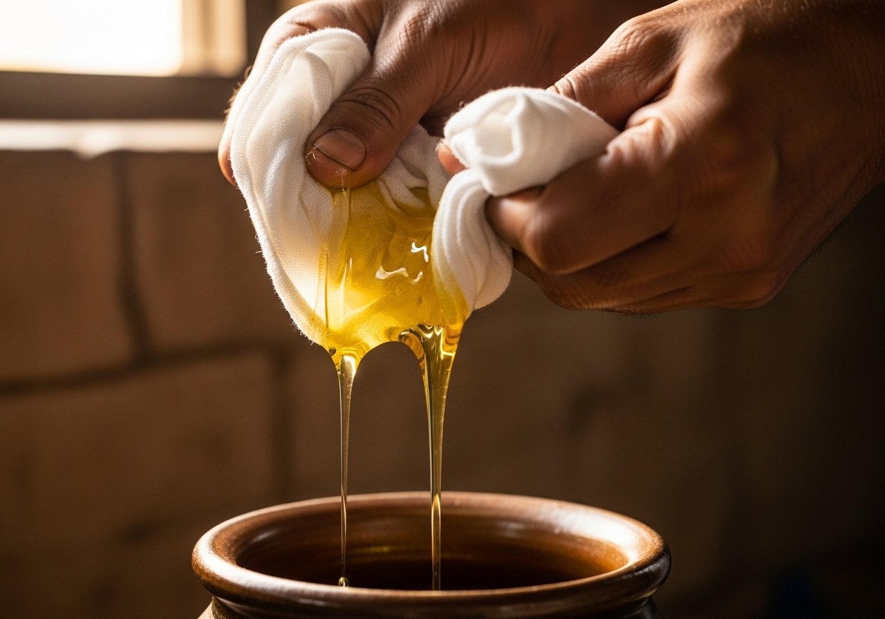 We filter this oil with a clean cotton cloth, employing the most ancient and natural method.